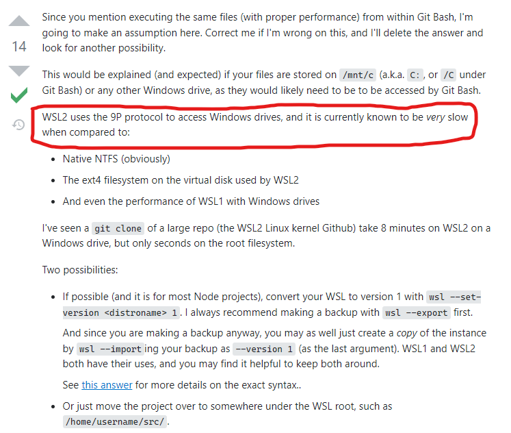 https://stackoverflow.com/questions/68972448/why-is-wsl-extremely-slow-when-compared-with-native-windows-npm-yarn-processing Why is WSL extremely slow when compared with native Windows NPM/Yarn processing?