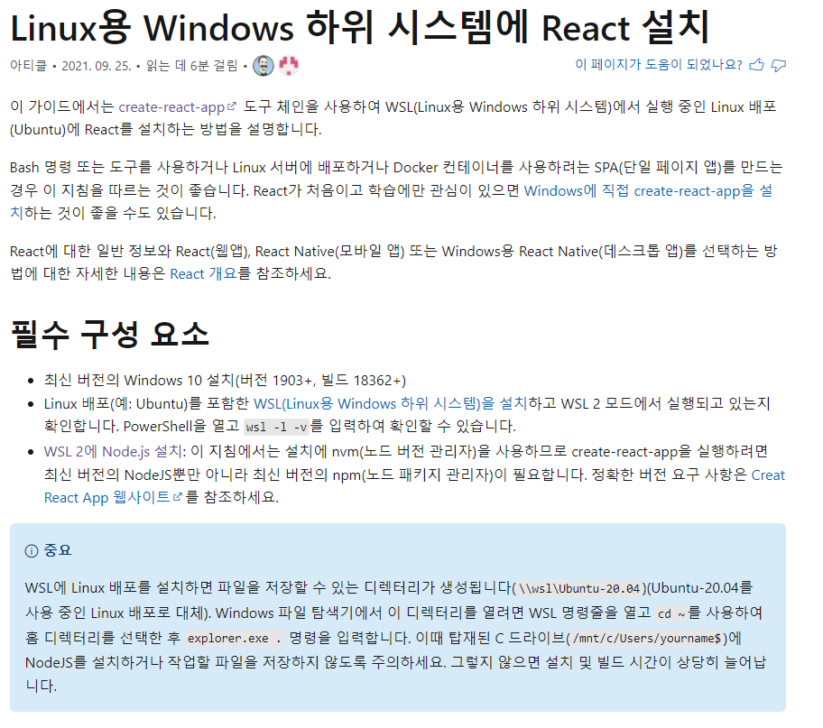 https://docs.microsoft.com/ko-kr/windows/dev-environment/javascript/react-on-wsl https://docs.microsoft.com/ko-kr/windows/dev-environment/javascript/react-on-wsl