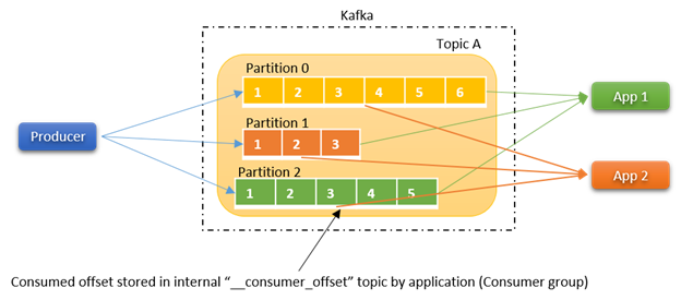 위 그림에서처럼 하나의 토픽(Topic A)을 consumer App 1과 App 2이 동시에 구독할 수 있다.