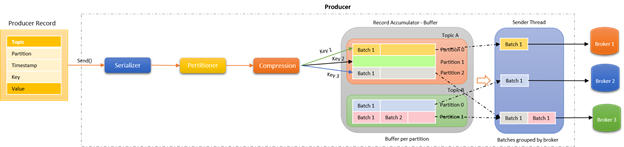 그래서 producer는 지정된 만큼 메시지를 저장했다가 한 번에 broker로 전달한다. 이 과정은 batch processing이라고 하며, producer 내부의 Record Accumulator(RA)가 담당하여 처리한다. RA는 각 토픽 파티션에 대응하는 배치 큐(Batch Queue)를 구성하고 메시지들을 레코드 배치(Record Batch) 형태로 묶어 큐에 저장한다.