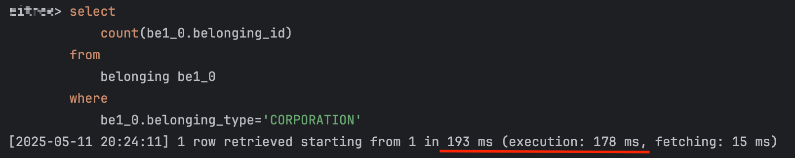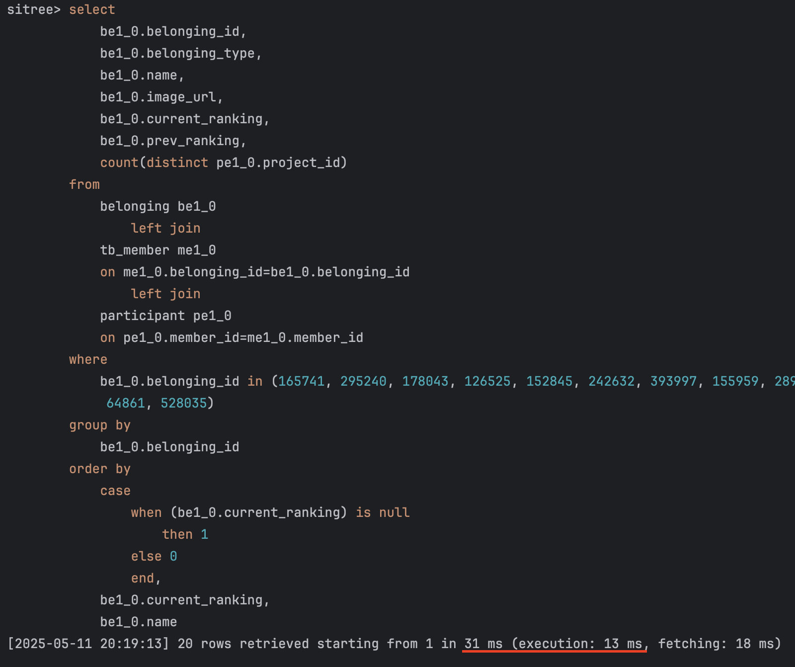 CREATE index belonging_ranking_index ON belonging (belonging_type, current_ranking, name); CREATE INDEX idx_tb_member_belonging_id ON tb_member(belonging_id); CREATE INDEX idx_participant_member_id ON participant(member_id);쿼리 결과는 다음과 같습니다.