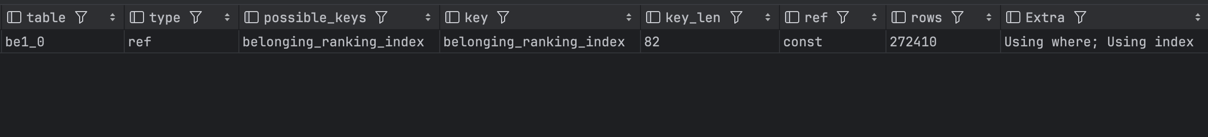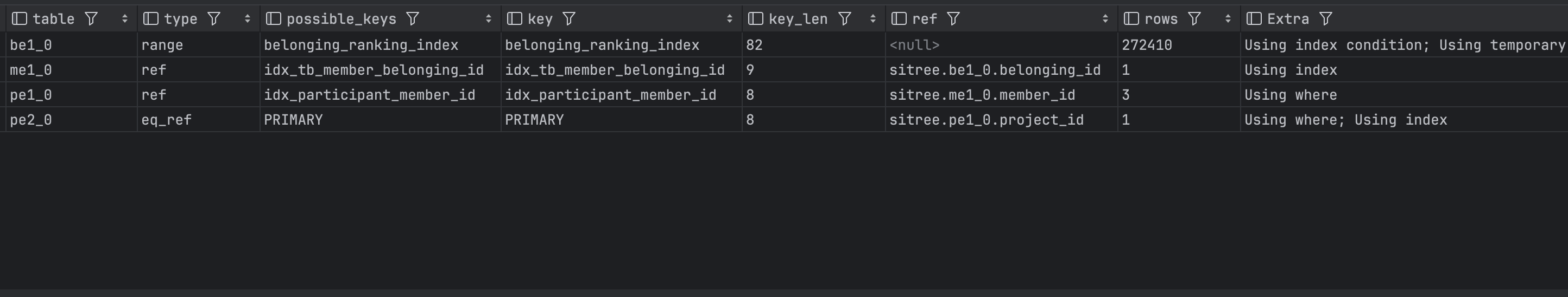 CREATE index belonging_ranking_index ON belonging (belonging_type, current_ranking, name); CREATE INDEX idx_tb_member_belonging_id ON tb_member(belonging_id); CREATE INDEX idx_participant_member_id ON participant(member_id);- 이 인덱스를 통해 WHERE belonging_type = ? 필터링과 ORDER BY current_ranking, name 정렬을 동시에 커버치는 것을 노렸습니다.