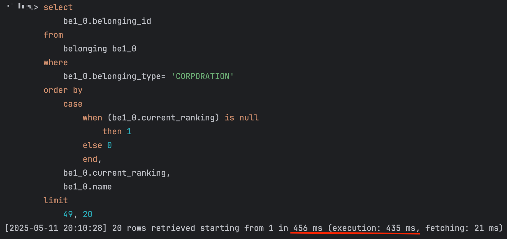 SELECT belonging_id FROM belonging WHERE belonging_type = ? ORDER BY current_ranking, name LIMIT ?, ?- 이후 해당 ID들을 기반으로 필요한 Join을 수행하여 데이터 조회하였습니다.