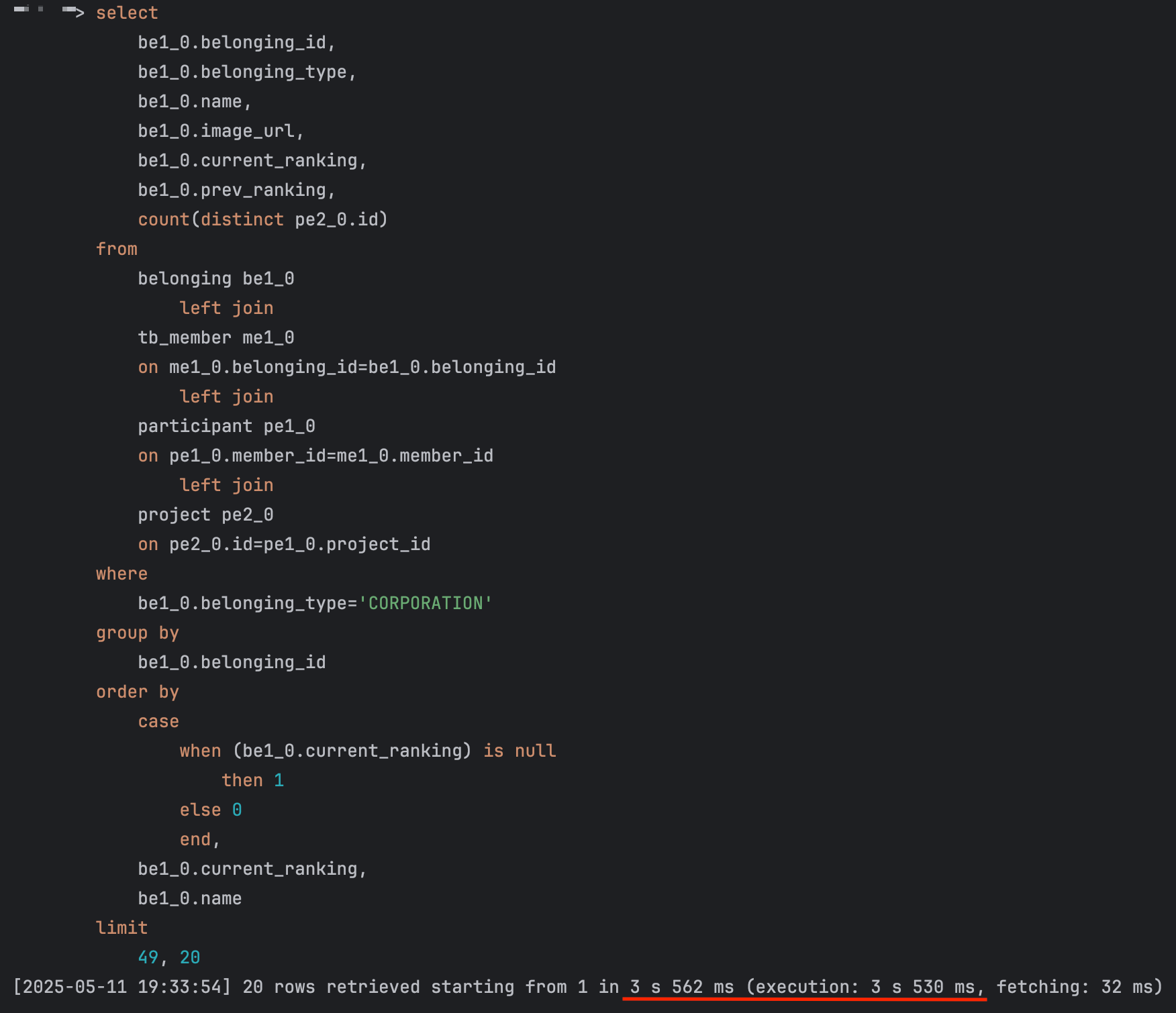 CREATE index belonging_ranking_index ON belonging (current_ranking, name, belonging_type); CREATE INDEX idx_tb_member_belonging_id ON tb_member(belonging_id); CREATE INDEX idx_participant_member_id ON participant(member_id);쿼리 결과는 다음과 같습니다.