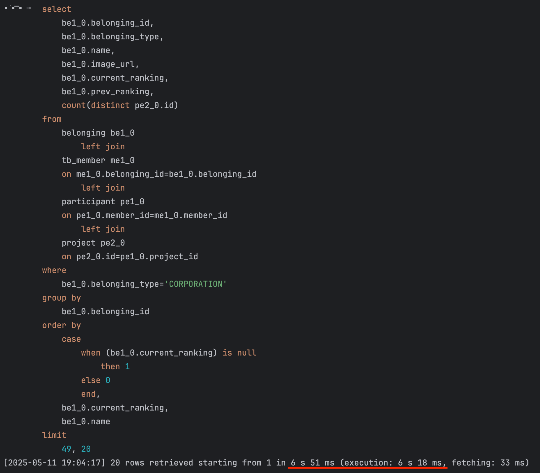 select be1_0.belonging_id, be1_0.belonging_type, be1_0.name, be1_0.current_ranking, be1_0.prev_ranking, count(distinct pe1_0.project_id) # 프로젝트 개수 count from belonging be1_0 left join # 소속의 속한 사람 join tb_member me1_0 on me1_0.belonging_id=be1_0.belonging_id left join participant pe1_0 # 소속의 속한 사람이 참여한 project join on pe1_0.member_id=me1_0.member_id where be1_0.belonging_type=? group by be1_0.belonging_id order by case when (be1_0.current_ranking) is null then 1 else 0 end, be1_0.current_ranking, be1_0.name limit 0, 20문제 원인 분석