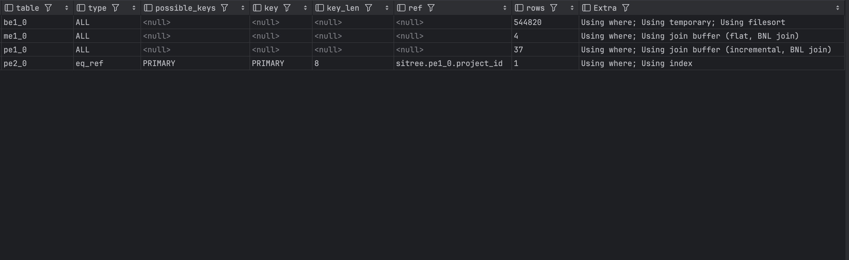 be1_0, me1_0, pe1_0 에 대해서 테이블 풀스캔(type = ALL)이 일어나고 있었고, be1_0 에 대해서는 인덱스를 통한 정렬이 아닌 별도로 정렬(Extra = Using filesort)이 일어나고 있었습니다.