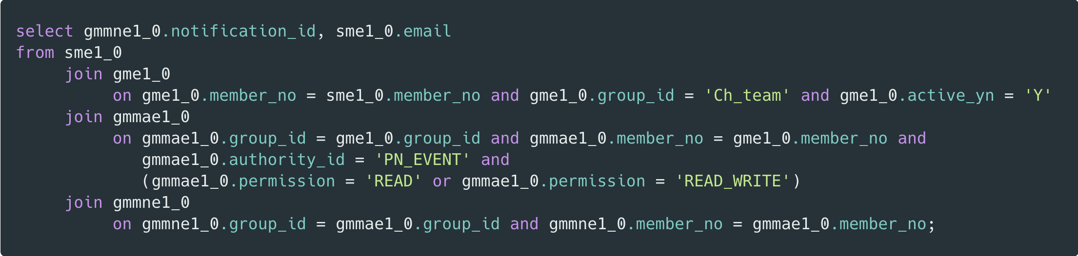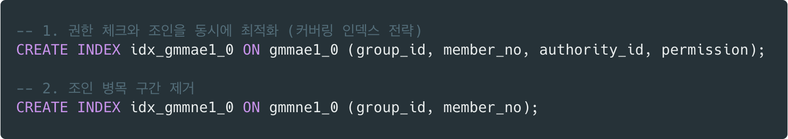 gmmae1_0테이블의 과도한 데이터 탐색이 비효율을 야기 했습니다.- 인덱스가 조인 조건(group_id, member_no)이나 필터 조건(authority_id, permission)을 모두 커버하지 못해, 일단 많은 양의 데이터를 읽어온 뒤 메모리에서 하나하나 대조하며 버리는 작업을 반복했습니다.
